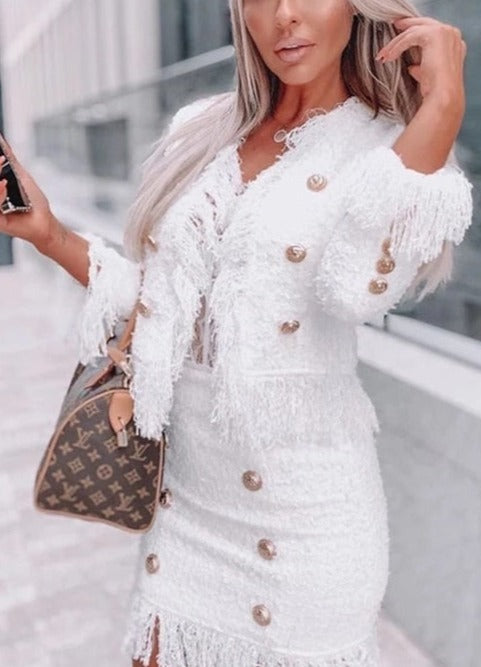 Suitable for business and pleasure. Our ANGELICA TWEED JACKET & SKIRT blazer has golden metal buttons, elegant design, quality tweed fabric.