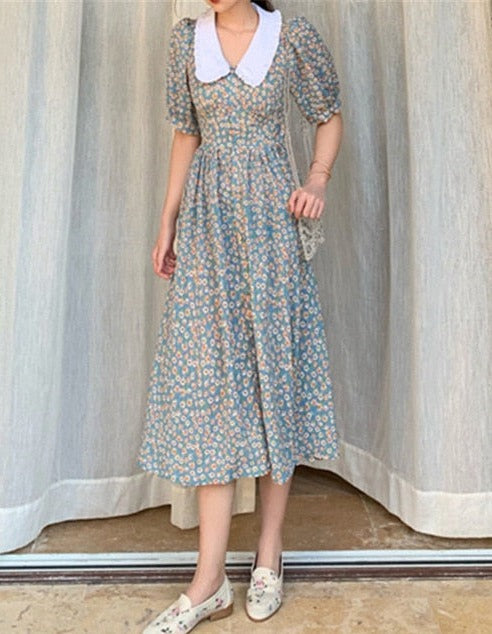 CINDY KOREAN DRESS crafted from chiffon, has Peter pan style collar and elegant midi length