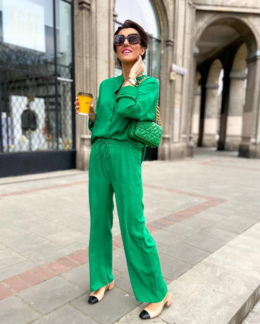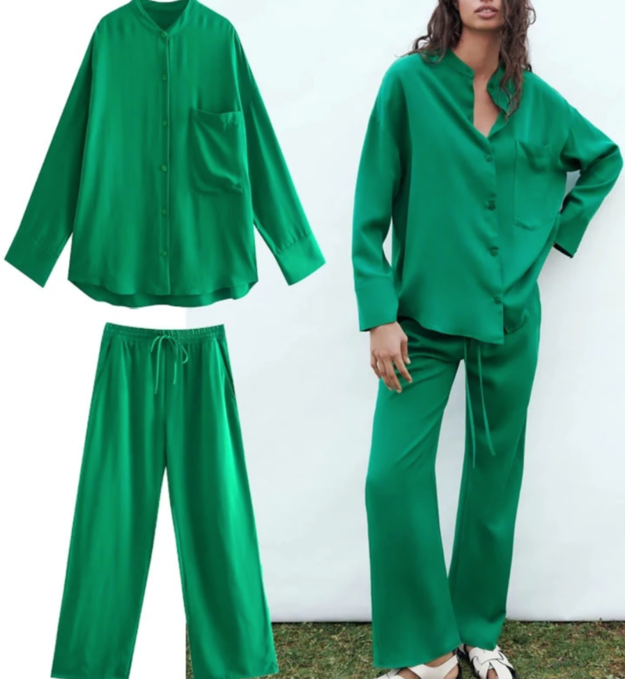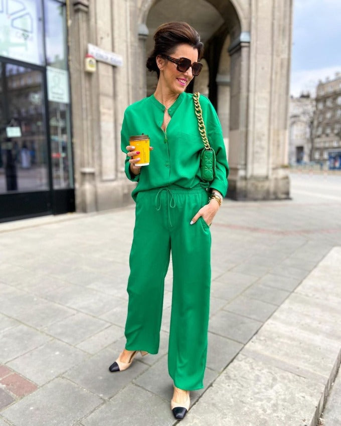 MOROCCO 2 PIECES SET. Elegant shirt in trendy green color, that has an oversized elegant fit & chic pants.