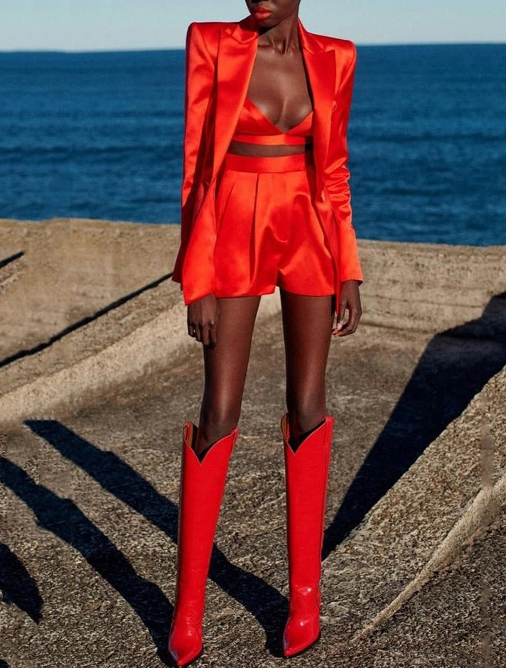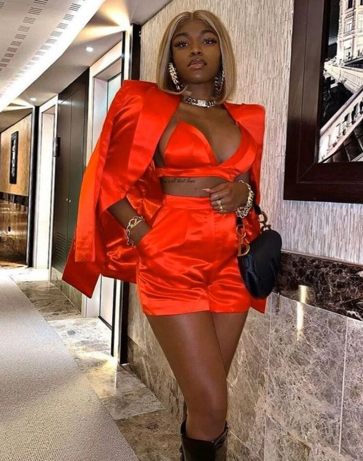 - Includes top, jacket and shorts